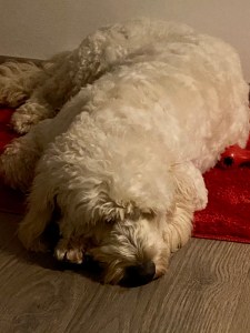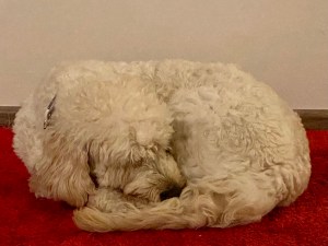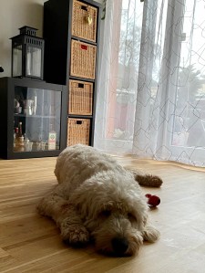 Dann war unser Vormittagstraining vorbei und wir waren allein. Er und ich. Beide total aufgeregt, nervös und unruhig. Harry stromerte durch die Wohnung, verfolgte mich auf Schritt und Tritt. Ich ging zur Kaffeemaschine. Tapp tapp tapp. Ich ging ins Bad. Tapp tapp tapp. Ich ging zum Sofa. Tapp tapp tapp. Ich hatte jetzt einen Hund, nur überhaupt keine Ahnung, wie ich mit ihm umgehen, was ich mit ihm tun sollte. Mit Tieren generell habe ich keine Erfahrungen, da ich gegen viele allergisch bin. Durch puren Zufall fand ich 2016 heraus, dass ich nur auf manche Hunderassen reagiere. Darum auch ein Goldendoodle. Und so einer saß schließlich neben mir mit seinen schäfchenweichen Goldlöckchen, gerade nah genug, dass ich ihn streicheln konnte und wir „nahmen Kontakt auf“. Mehr als Kopf und Rücken ging da noch nicht – richtig putzig, wenn ich heute darüber nachdenke, wo ich ihm den Schlaf aus den Augen reibe, seine Pfoten und Ohren putze und die Rute striegle.